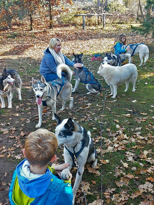 Traperska Osada położona jest na skraju Parku Krajobrazowego "Puszcza Zielonka". To atrakcyjnie usytuowany teren z wieloma atrakcjami agroturystycznymi, doskonały na organizację spotkań dla dzieci. Największą atrakcją są psie zaprzęgi. W Osadzie żyje wataha psów północy, które swoim wyglądem przypominają wilki.To futrzaki o wybitnie łagodnym charakterze i usposobieniu dla człowieka. Są to wyszkolone psy, a zajęcia odbywają się pod opieką doświadczonego mushera. W warunkach bez śniegu możliwość powożenia zaprzęgu za pomocą specjalnych wózków na kółkach.